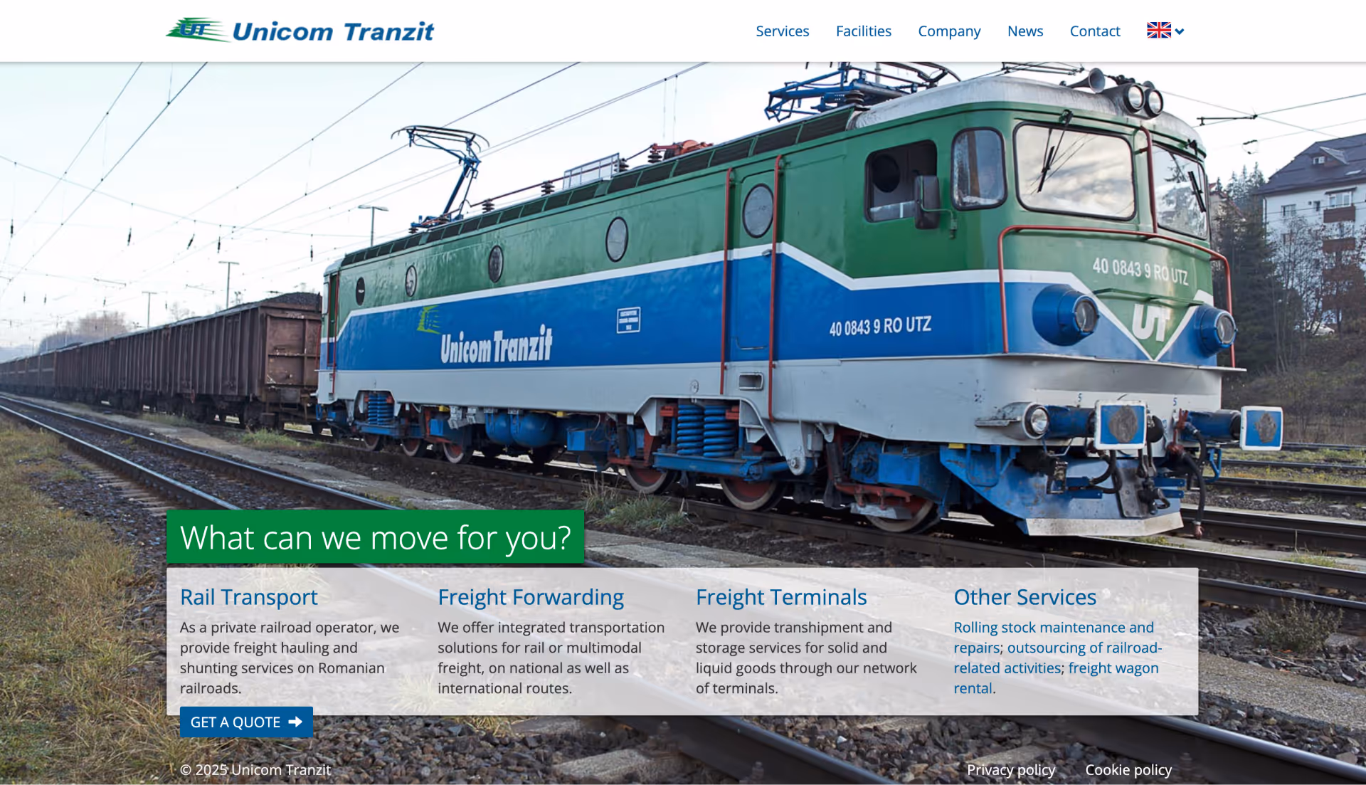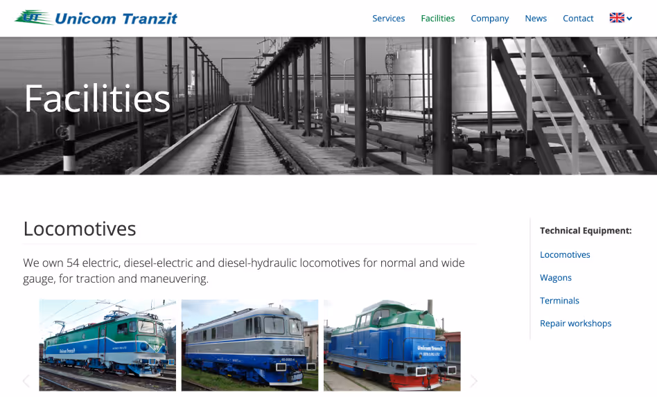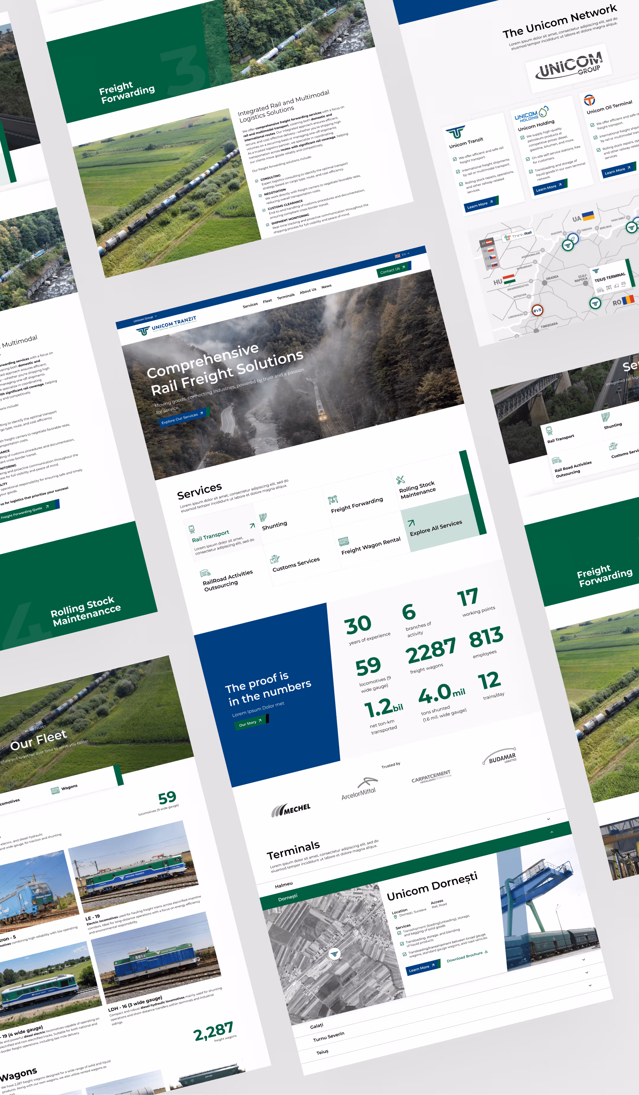 Unicom Tranzit hauls millions of tonnes across Eastern Europe, but its previous site felt more siding than express: dated locomotive shots, a tangle of service pages, and little proof of the network’s true reach. Our task was to switch the signal to green—show rolling-stock capacity and terminal coverage at a glance, steer visitors to the right service in two clicks, and refresh the visual language with rail-green and steel-blue accents that convey a modern, reliable freight partner.